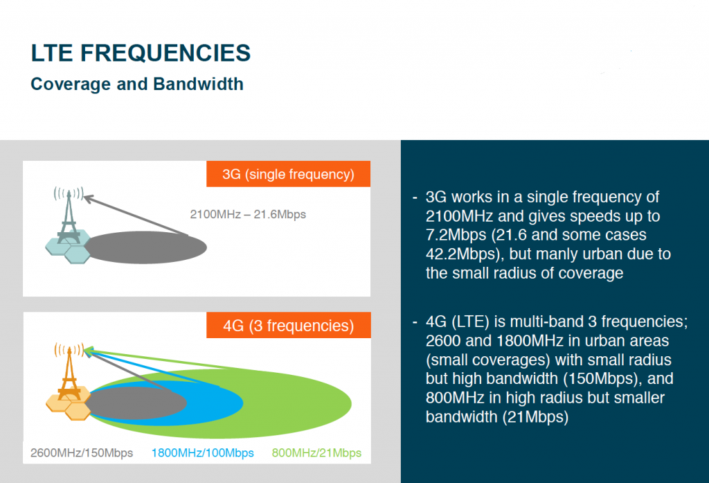 LTE’nin 4G ve 3G’ye oranla en önemli farkı, frekans aralıkları ve bant genişliği. Bu arada evet 4G farklı bir sistem 4G/LTE farklı bir sistem belirtelim. İşin ilginç yanı ise LTE aslında bir mobil protokol değil, yani ses ve sms için geliştirilmiş bir sistem değil. Kendileri bilgi işlemden geliyorlar. Aslen bir IP protokolu olan LTE, Voip, yani voice over ip, yani data hatları üzerinden ses taşıma protokolleri geliştikçe, aynı şey sms için de geçerli, yüksek data taşıma kapasitesi yüzünden mobil dünyaya çekilmiş bir sistem. Yani aslında hepsinden eski sayılır, ilginç değil mi ?