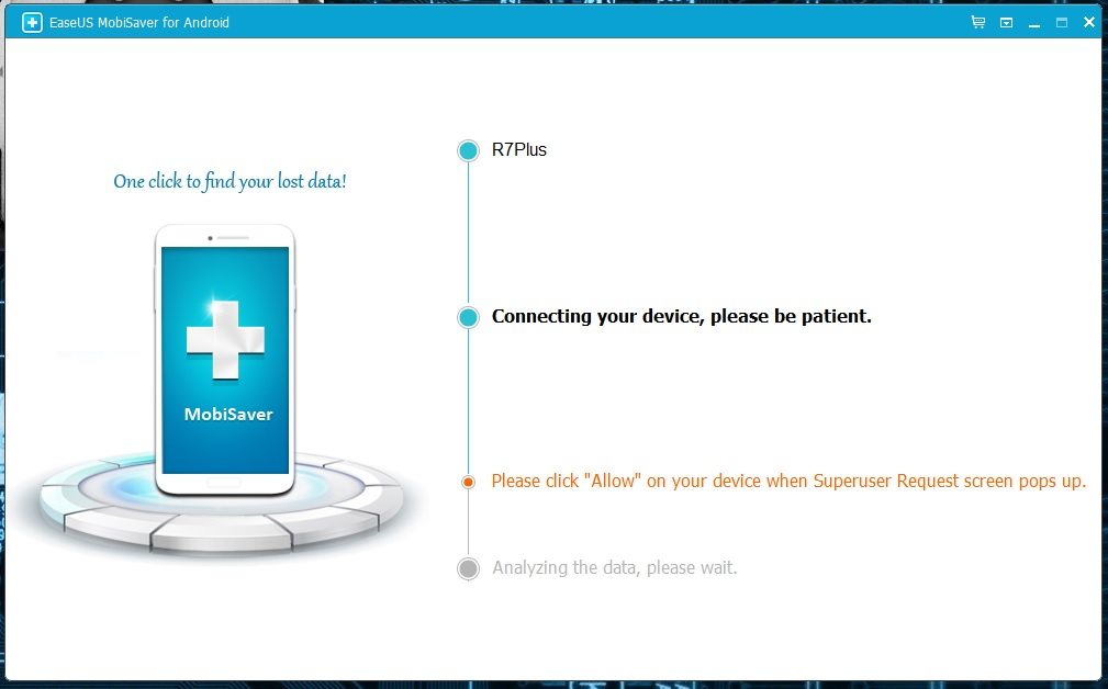 Telefonunuzu root’ladınız, geliştirici seçeneklerinden USB hata ayıklamayı açtınız, gerisi sadece usb kabloyu takarak Android için EaseUS MobiSaver’ı başlatmak kalıyor.