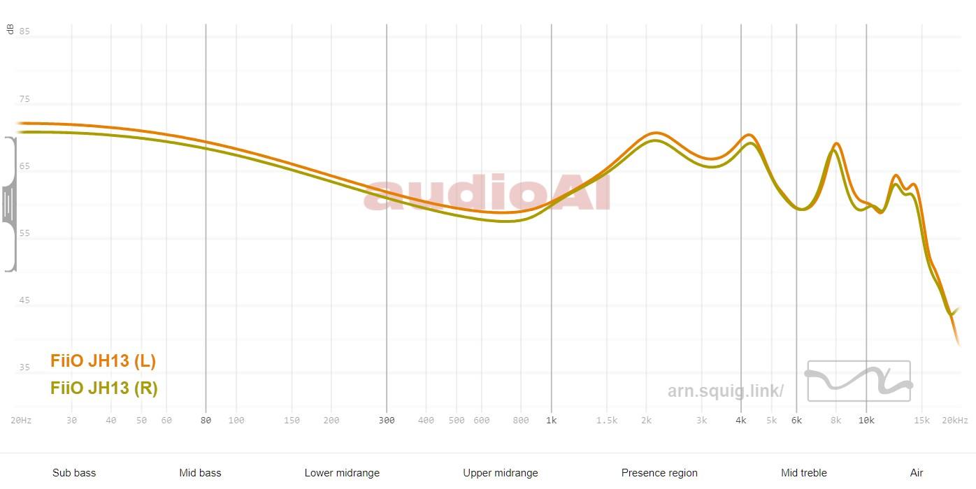 This frequency response graph for the FiiO JH13 reveals a tuning that prioritizes a “fun” and engaging sound signature over strict neutrality. With its hybrid configuration of a single dynamic driver and two balanced armatures, the tuning focuses on an impactful low-end and a vibrant upper-midrange presence.