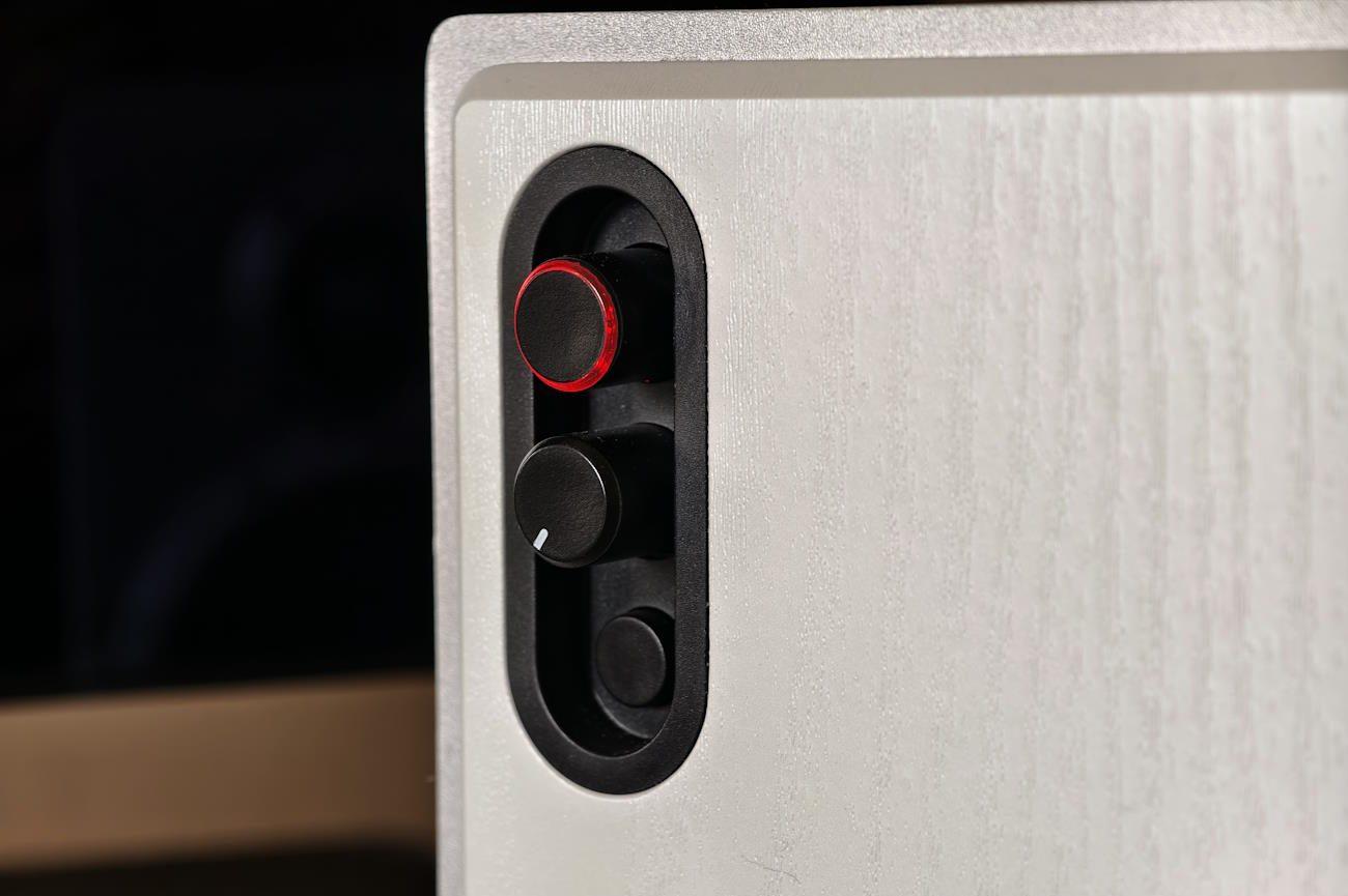 The cabinet features a sturdy build with 12 mm-thick high-density MDF wood and 9mm simulated wood veneer side panels that help reduce unwanted resonance. The main speaker weighs about 1,750g, while the secondary speaker weighs around 1,660g, giving the setup a solid presence on the desk. It also comes with two large physical control knobs and an RGB status indicator for easy, intuitive adjustments. Additionally, the package sports a remote control, allowing users to tweak settings and switch inputs from across the room.