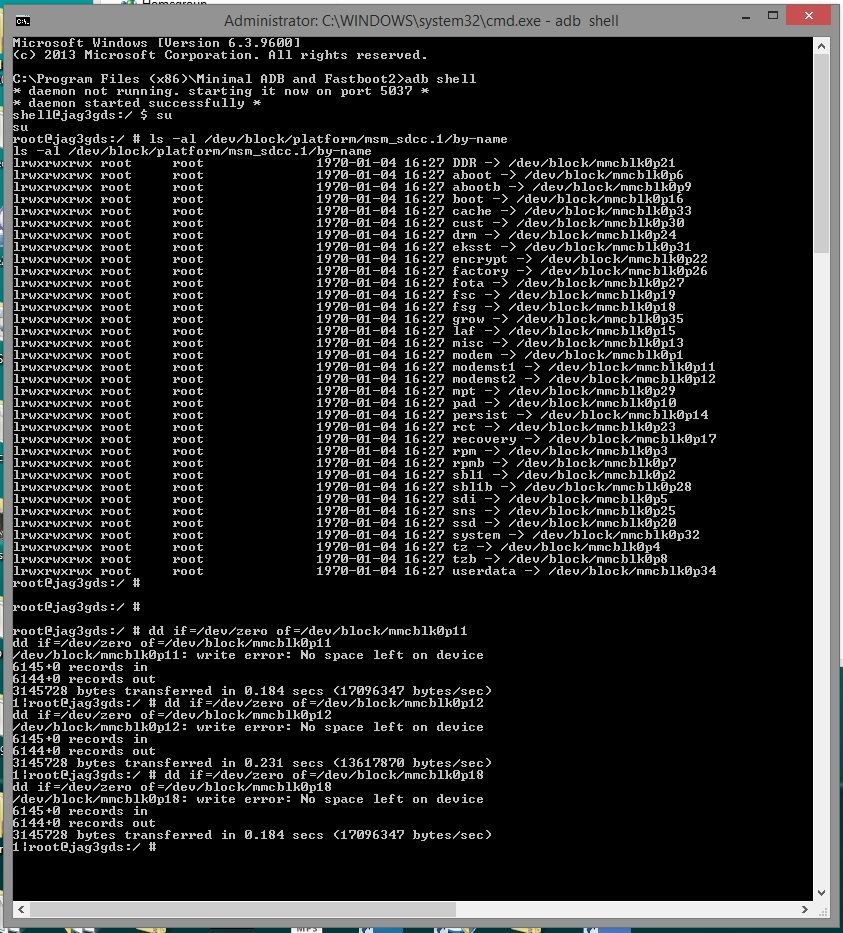 Komutu girdikten sonra tüm partisyonlar “/mmcblk0p”x” formatında satır adları ile diziliyor. Biz de modemst1, modemst2 ve fsg klasörlerinin karşılığına gelen partisyonlarının içini boşaltıyoruz. Yani bunca zamandır insanların geçemedikleri yazma korumasını kaldırmanın şekli, metodu budur. İçini boşaltmak, yasaklı tüm satırları kaldırınca, yasak da kendini unutmuş oluyor. Biz üzerine tekrar yazana kadar koruma kalkmış olacak. Bu kimi telefonlarda bize “imei 0/null” olarak, kimilerinde “invalid imei” olarak geri dönecek.