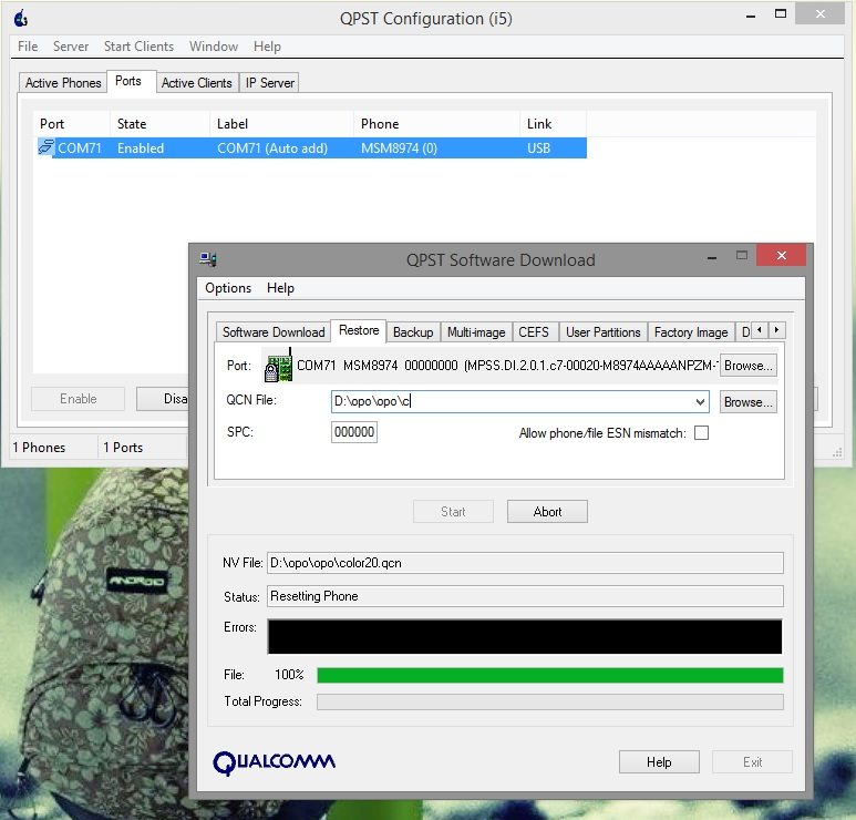 Daha önce aldığımız qcn formatındaki yedeğin üzerinde gerekli değişikleri yaparak imei tamir’li qcn’yi kaydetmiştik. Bu 3 partisyonun içlerini boşaltıktan sonra resimdeki gibi önce reboot ediyoruz. Telefon tekrar açtığında imeisi sıfırlanmış ve yasak kalkmış olarak karşımıza geliyor. Qpst üzerinden daha önce “backup” dediğimiz menünün bir yanındaki “restore” sekmesinden düzeltilmiş qcn’yi telefona geri yüklüyoruz. Qpst bazı telefonlarda bu işlemi yaptıktan sonra kendisi reboot ettirebiliyor, telefon tekrar açtığında tamir edilmiş imeiniz karşınızda. Bazı telefonlarda ise yedeği geri atıp restore ettikten sonra telefonu reboot ettirmeye çalışır, iletişim kuramaz ve hata verir, Xiaomi’lerde hata verir örneğin. O durumda telefonu el ile manuel reboot ediyoruz, kapatıp açıyoruz, ve Hayırlı Uğurlu Olsun 🙂