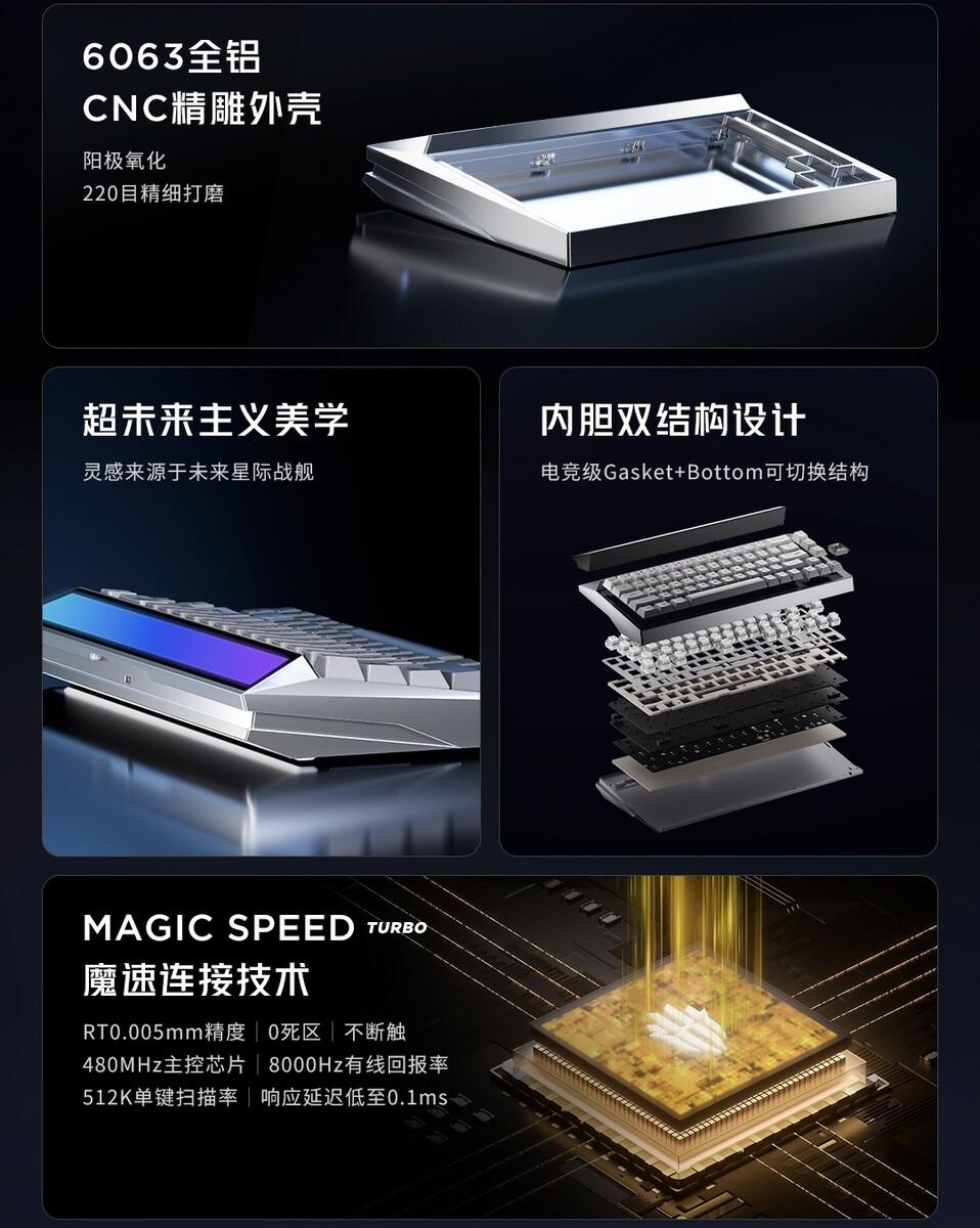 The Ice Blade Magnetic Axis Keyboard, which is already selling in China. According to initial teasers, the Ice Blade features a 6063 all-aluminium CNC anodised shell with an 8,000 Hz wired polling rate and 0.1 ms response times. Moreover, the keyboard leverages RedMagic Butterfly Magnetic switches, which sit beneath a wide and customisable RGB light bar.