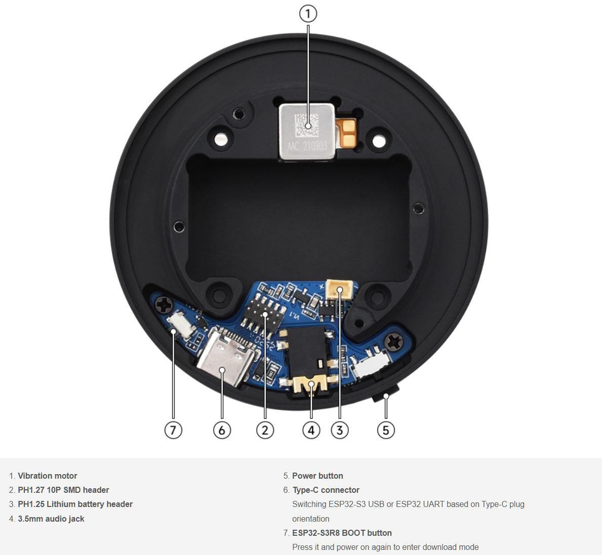 - Onboard audio decoder chip, microphone, knob encoder, vibration motor, TF card slot, and battery recharge management module