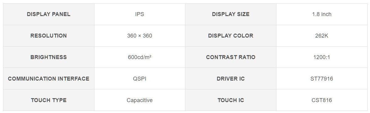 - Onboard 1.8inch LCD display, 360 × 360 resolution, 262K color