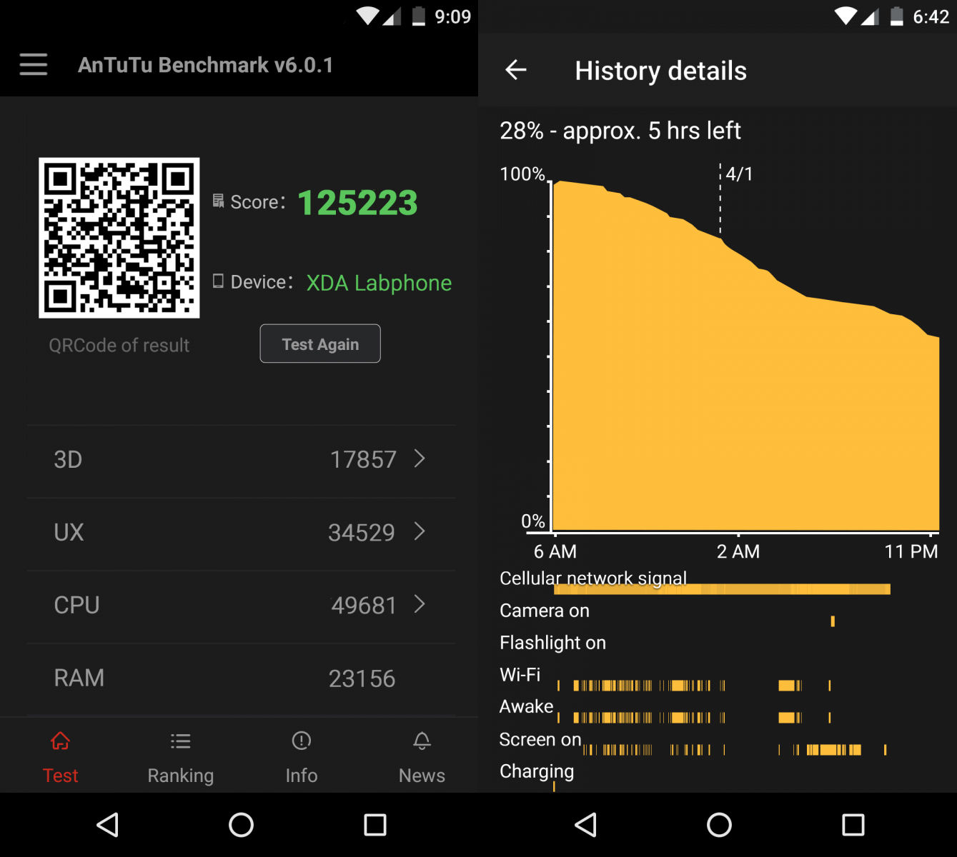 Donanım kısmında ise Labphone’un kullanıcıların istekleri karşılayacağını belirten M. Brack telefonun Snapdragon 820 işlemci ile geleceğine yazısında yer verdi. Kernel özelleştirmeleri kısmında ise xda’nın tecrübeli geliştiricisi olan Franco’nun yer alacağını söylemek gerekiyor. Telefonda 4G DDR4 RAM bulunacak ve M. Brack’ın belirttiğine göre RAM verimi %40 kadar arttırıldığı için normal bir telefonda kullanılan RAM’lerden daha etkin kullanım sağlanacak. Aşağıda cihaza ait pil kullanımı ve Antutu benchmark sonuçlarını bulabilirsiniz.