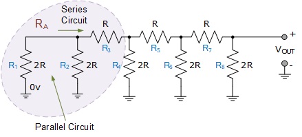 As its name implies, the “ladder” description comes from the ladder-like configuration of the resistors used within the Resistive Ladder network. An R2R resistive ladder network provides a simple means of converting digital voltage signals into an equivalent analog output. The output signal as a result of all these input voltage points is taken from the end of the ladder which is used to drive the inverting input of an operational amplifier. Then the R2R resistive ladder network is nothing more than long strings of parallel and series-connected resistors acting as interconnected voltage dividers along its length, and whose output voltage depends solely on the interaction of the input voltages with each other.