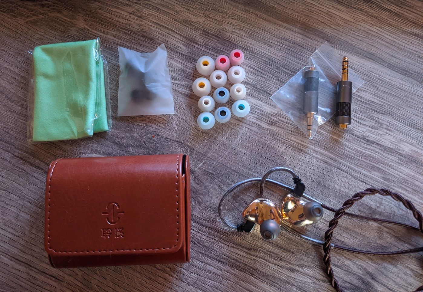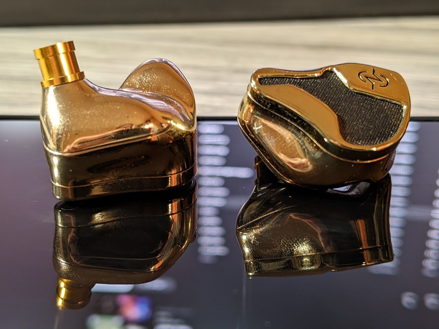CCZ Plume features full-metal earpieces housing a five-driver hybrid configuration on each side. The shiny gold color shells are on the bigger side for some small ears out there, but also lightweight enough and sit very good in your ears because of their ergonomic design, which leads to problem-free long listening sessions.