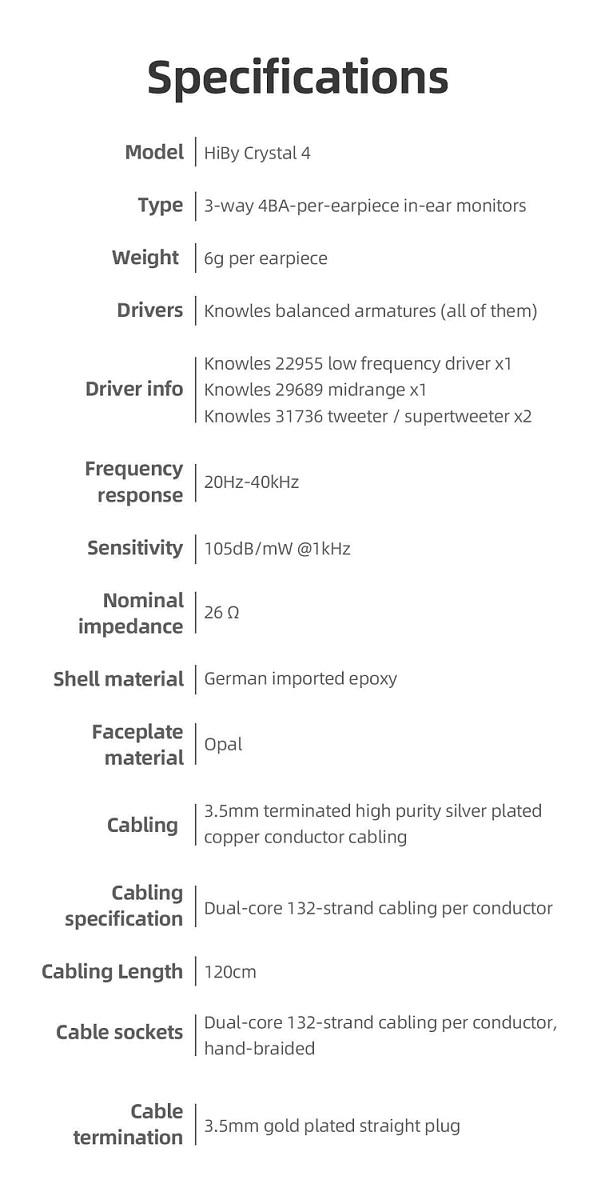 HiBy has equipped the Crytal 4 with four premium Knowles BA drivers per side. There’s a Knowles 22955 powerful low-frequency driver, one 29689 smooth midrange driver, and a dual 31736 composite driver for natural and airy high/ultra-high frequency response. These drivers are arranged in a two-way frequency crossover for providing a clean and distortion-free output.