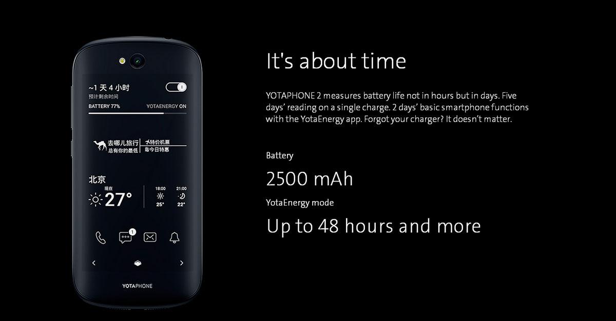 2500 mAh pile sahip olan Yotaphone 2’de sadece mono ekranı kullanırsanız 5 gün ! kullanım süresi veriyor, özel bir enerji modunda ise 2 gün normal kullanım mümkün.