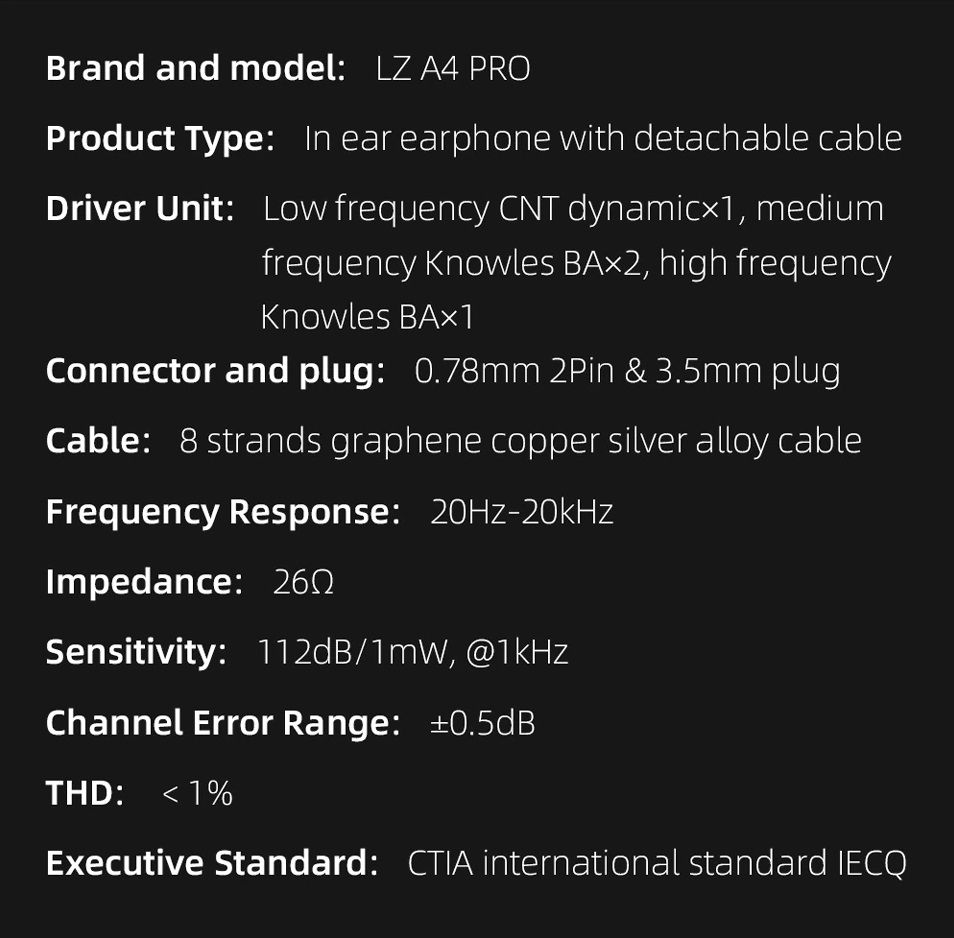 LZ A4 PRO is a hybrid 4 driver units earphone with a mixed dual adjustable tone design. The mid-frequency is handed by two Knowles BA, high frequency is handled by one Knowles BA. The low frequency is handled by a dual cavity CNT diaphragm dynamic driver.