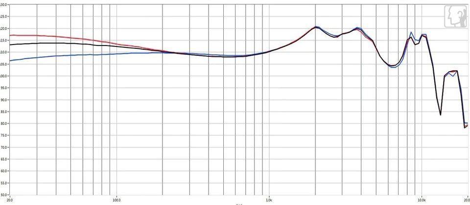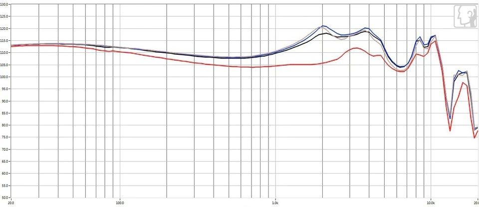 The frequency response of the A4 PRO three-color cavity tuning hole (red, black, and blue curves correspond to the cavity tuning hole of the corresponding color), the default black filter.