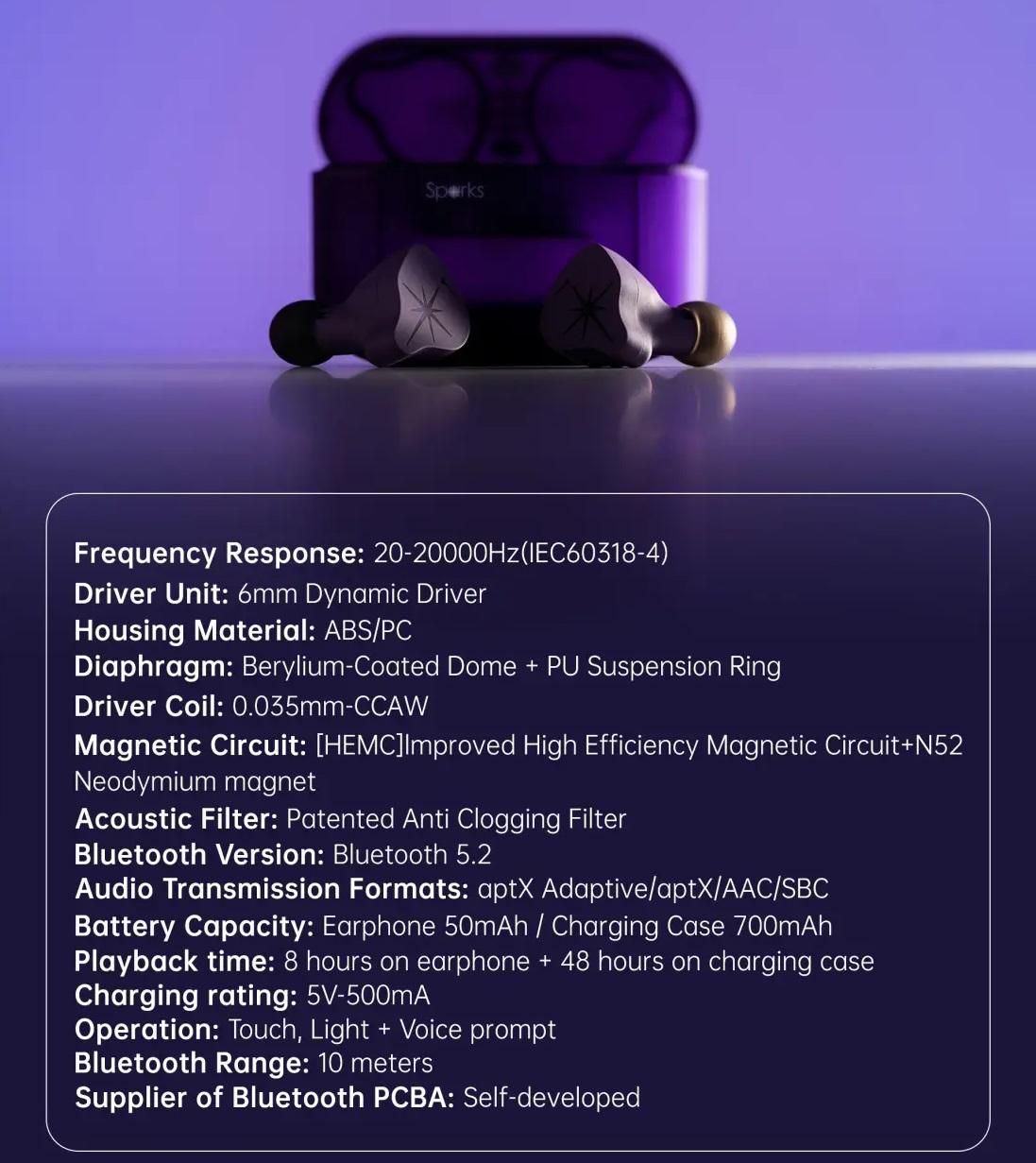 Sparks houses a 6mm dynamic driver coated with Beryllium and supported by a PU suspension ring, which ensures that the Sparks can deliver a dynamic sound while maintaining clarity. Relying on the built-in DSP of the Bluetooth chip and professional tuning by the acoustic teams at Moondrop, the frequency response of Sparks TWS is fully in line with the new VDSF target curve. The pair has a lively and energetic sound output with rich punchy bass, beautiful vocals, and a detailed treble portion.