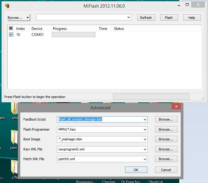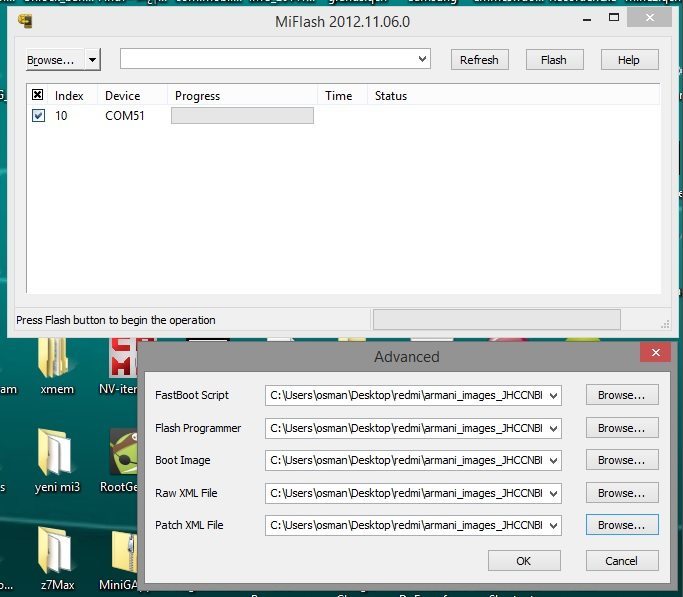 Karşımıza 5 seçenekli bir ekran çıkıyor. İlk sıradan başlayarak gerekli dosyaların yollarını tanımlıyoruz. İlk sırada gözüken “Fastboot Script” romu açtığımız dosyadaki ana klasörde bulunuyor, “flash_all_except_storage.bat”yi seçersek iç hafıza hariç format atar ve sonra yükler (iç hafızada önemli dosyalarınız,resim vs varsa bunu seçin), “flash_all.bat”yi seçersek iç hafıza dahil tümden telefonu formatlar ve sonrasında sistemi yükler. Sonrasındaki diğer 4 satırın karşıklarını rom klasörü içindeki “images” dosyasından seçeceğiz, zaten tüm seçmemiz gereken dosyalar aynı isimde images klasörünün içinde bulunuyor. Bu arada Miphone yazılımı çalıştırdıktan sonra üstten “refresh” tıklıyoruz, fastboot modundaki veya Qualcomm HS-USB Diagnostics 9006 modundaki telefonun portu pencerede belirecek.