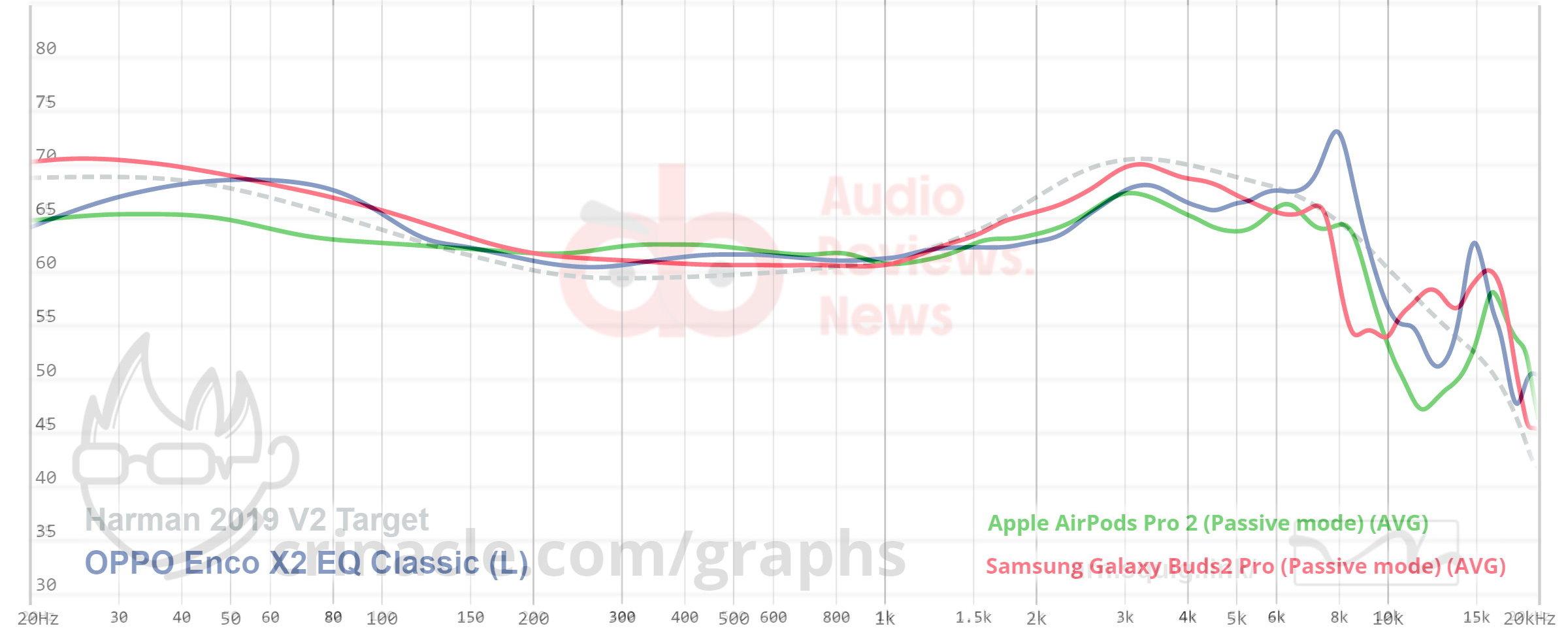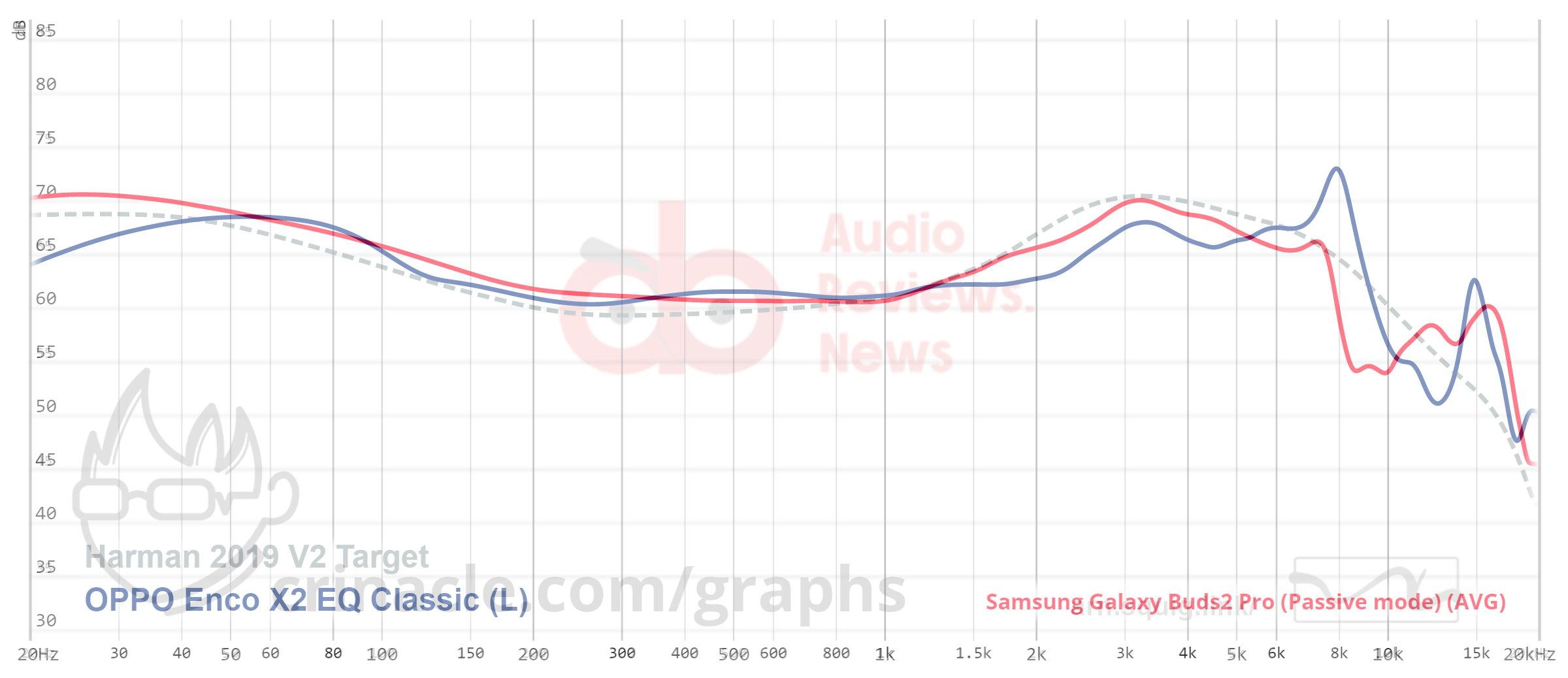 As you can see from the graph the Buds2 Pro perfectly follows this target. A few decibels elevation on lows and mids, reaching the target around 3K region, very close altogether. You also see the Enco X2 also wander around this target, but with some changes on the bass and treble regions, but closely aligned on the mids.
