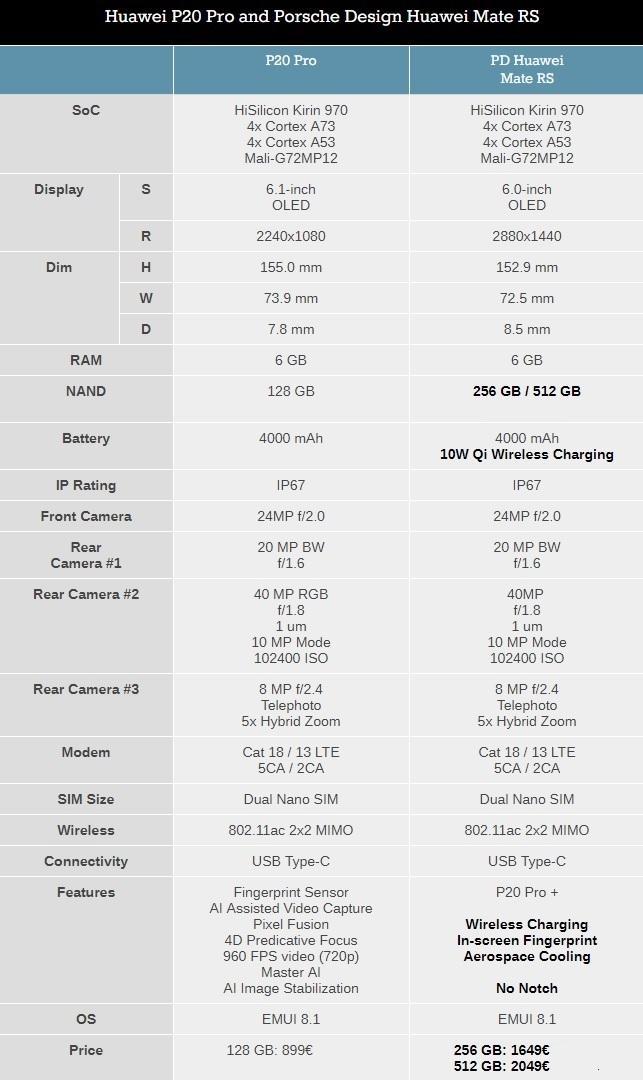 Huawei P20 Pro ile Porsche Design Huawei Mate RS’in farklarını gösteren tablo :