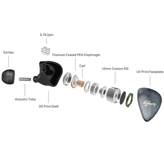 QOA has designed the acoustic architecture inside the Affinity earpieces using a stainless steel HF acoustic tube in its ear nozzle. It is referred to as D.L.R.C(Dual Layered Resonance Control) system, The sound signal is directly taken from the driver unit to the ear nozzle via this stainless steel acoustic tube.