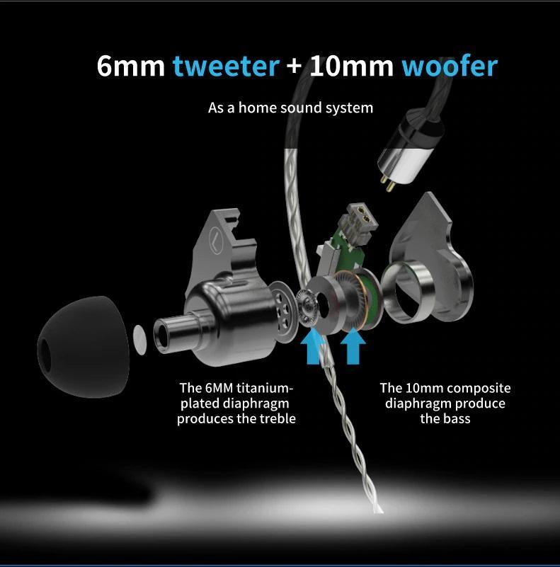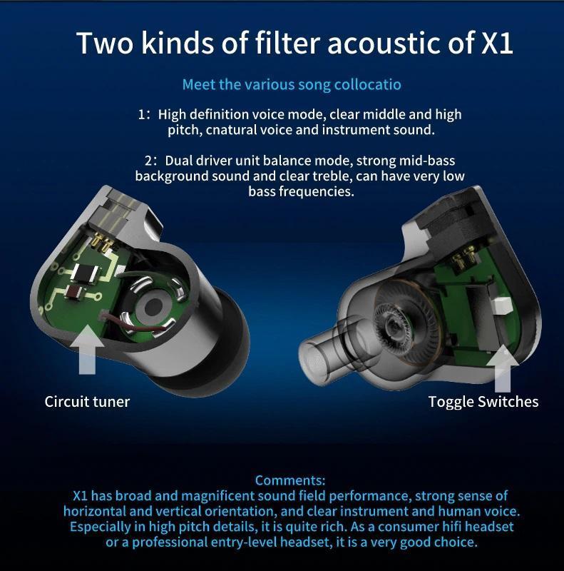 Smabat X1, has 2 dynamic drivers, 6mm for highs, 10mm for mids and lows, and equipped with a manual tuning controller for high definition voice mode and midbass balance mode.