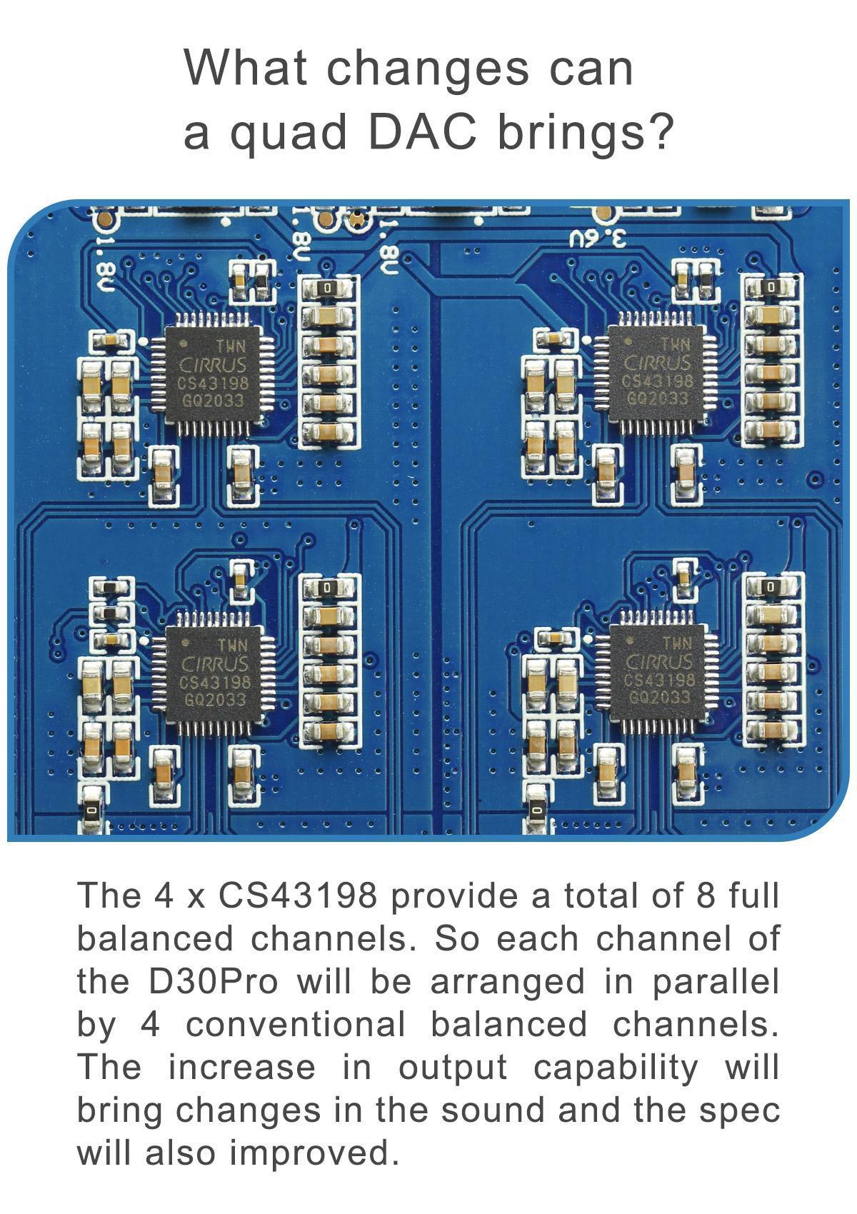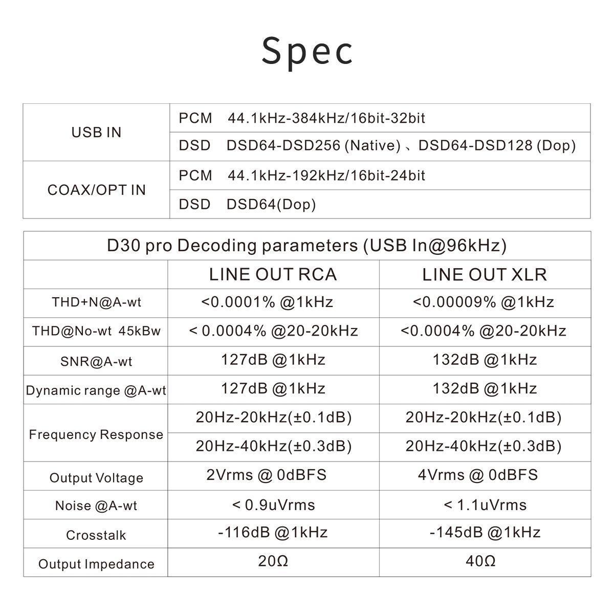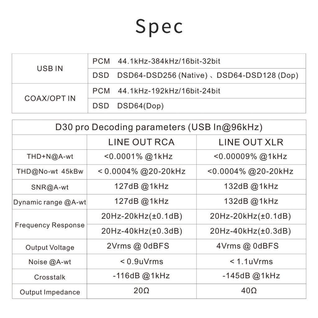 Coming as a direct upgrade to the highly appreciated entry-level D30 desktop DAC system, the D30 Pro takes things up and becomes a mid-tier high-performance desktop DAC. It is equipped with four high-performance DAC chips featuring CS43198 chips paired with an XMOS XU208 8-core USB signal receiver chip. It supports high-resolution audio signal decoding with PCM support up to 32-Bit/384kHz and DSD up to DSD256 natively. It has a super-low THD+N distortion rating at just 0.00009% with high SNR of 120dB.