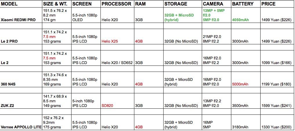 Listemizde bulunan telefonlardan en iyilerini seçmeye çalıştığımızdan, Helio X20 ve Helio X25 haricindeki işlemciler ile çalışan modelleri seçeneklerimiz arasından eledik. Qualcomm Snapdragon 820 işlemcisine sahip olan ZUK Z2 (Rio Edition)’ın da Redmi Pro’ya yakın fiyatlandırıldığını söylemek lazım, bu yüzden listeye ekledik. Aşağıda Redmi Pro ve muadillerine ait karşılaştırma tablosu var: